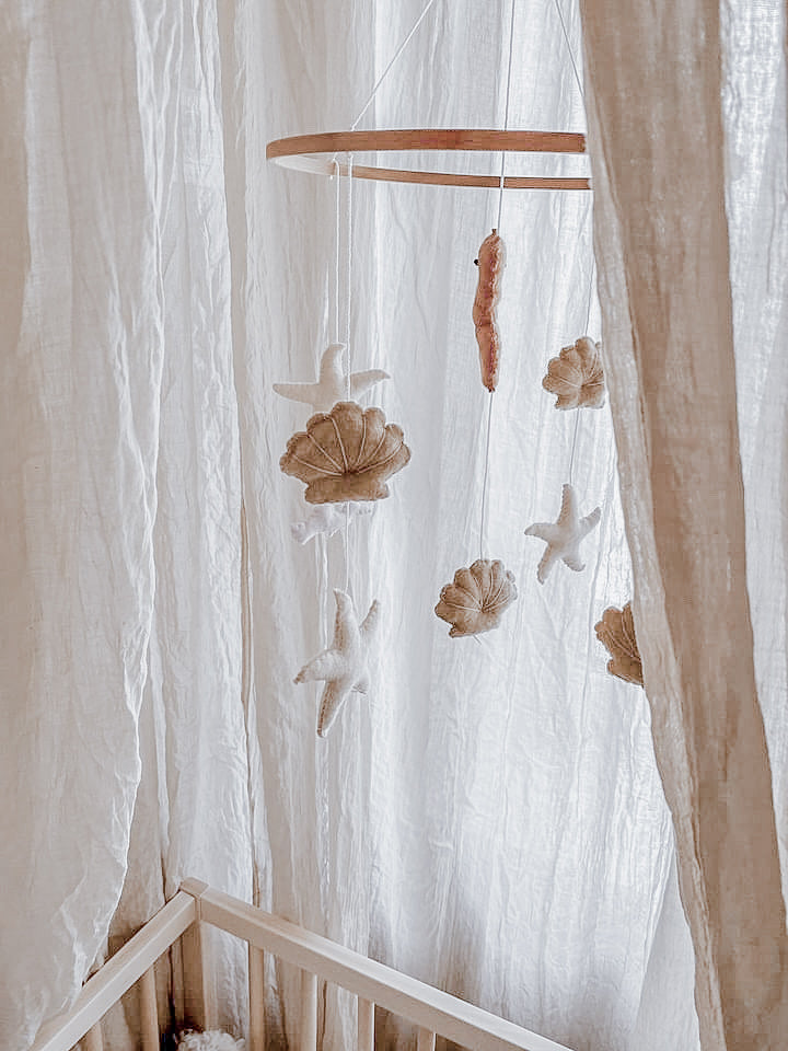 De babymobiel zeepaard en schelpjes neemt je kleintje mee op onderwateravonturen! De babymobielen zijn ook perfect als boxmobiel. Laat je kleintje genieten van de zachtheid en speelsheid van de boxmobiel van vilt. Elk stuk is met liefde gemaakt, met zorgvuldig gekozen kleuren en ontwerpen die de zintuigen van je baby stimuleren.